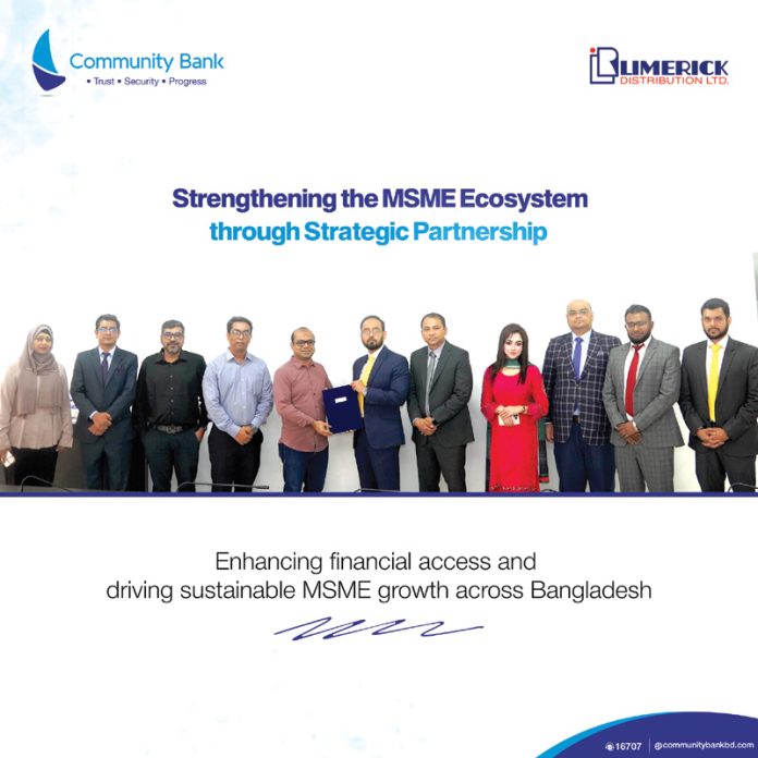 দেশের মাইক্রো, ক্ষুদ্র ও মাঝারি উদ্যোগ খাতে আর্থিক সহায়তা সসমৎ্রসারণে কৌশলগত অংশীদারত্ব গড়ে শংলেছে কমিউনিটি ব্যাংক বাংলাদেশ পিএলসি এবং লিমেরিক ডিস্ট্রিবিউশন লিমিটেড (এলডিএল)। এ ললেমঘ্য দুই প্রতিষ্ঠানের মধ্যে একটি সমঝোতা স্মারক স্বাক্ষরিত হয়েছে।